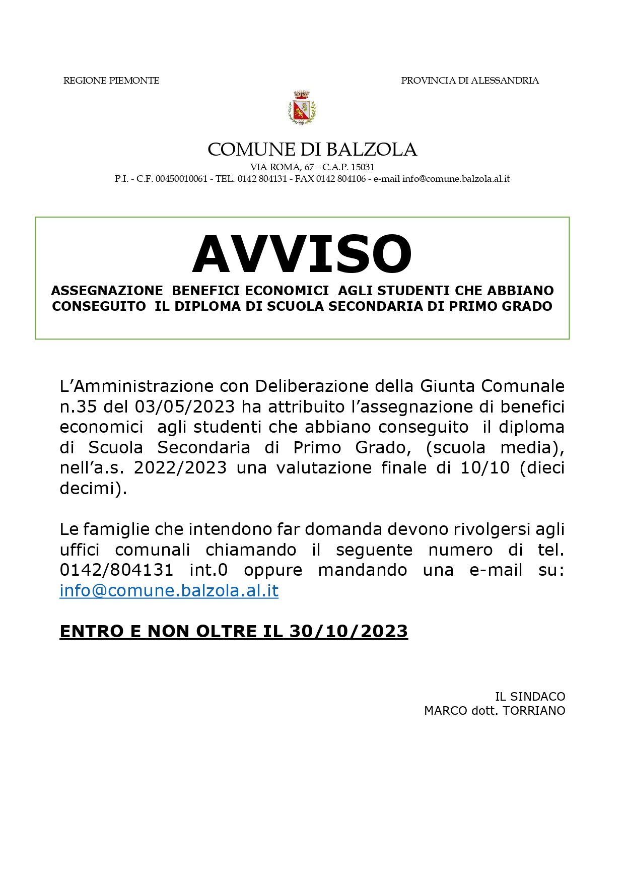 L’Amministrazione con Deliberazione della Giunta Comunale n.35 del 3/05/2023 ha attribuito l’assegnazione di benefici economici agli studenti che abbiano conseguito il diploma di Scuola Secondaria di Primo Grado, (scuola media), nell’a.s. 2022/2023 una valutazione finale di 10/10 (dieci decimi).