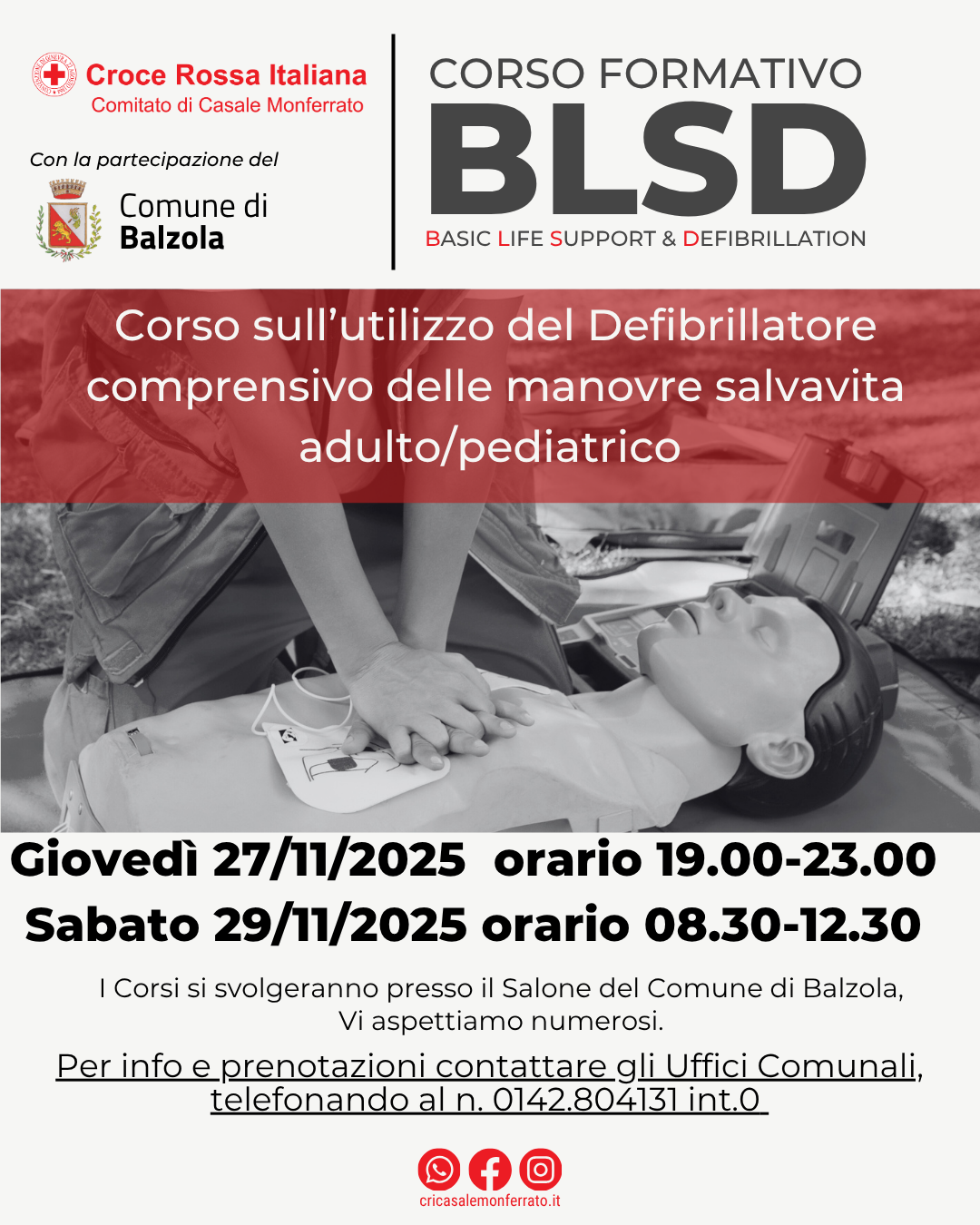 Il Comune di Balzola offre la possibilità ai propri residenti di partecipare al corso per l'uso del defibrillatore e manovre di disostruzione, mettendo a disposizione due corsi giovedì 27 e sabato 29 novembre.