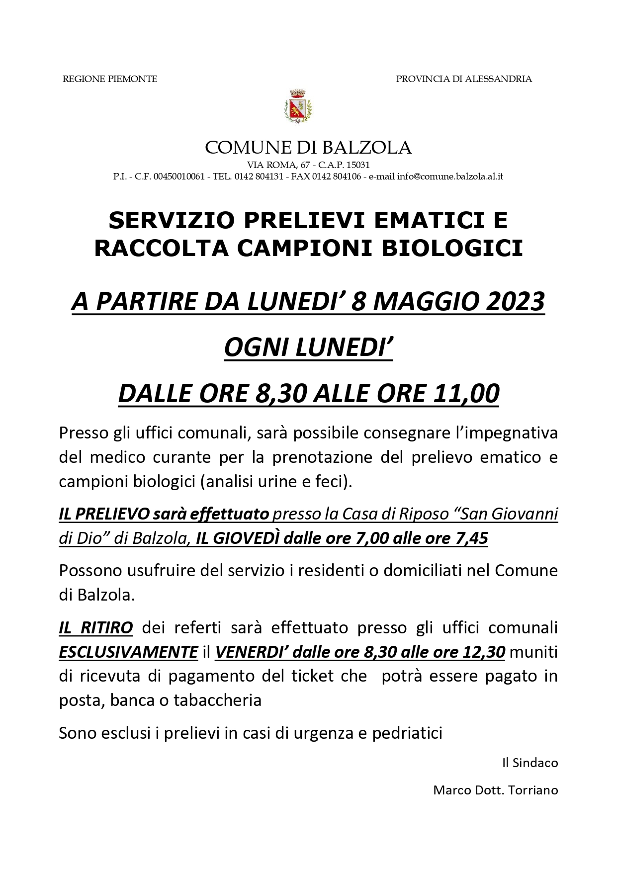 A PARTIRE DA LUNEDI’ 8 MAGGIO 2023 OGNI LUNEDI’ DALLE ORE 8,30 ALLE ORE 11,00